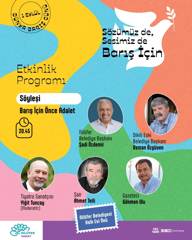 Bursa'da Nilüfer Belediyesi, 1 Eylül Dünya Barış Günü’nü, “Sözümüz de, sesimiz de barış için” sloganıyla Halk Evi önünde düzenleyeceği özel bir programla kutlayacak.