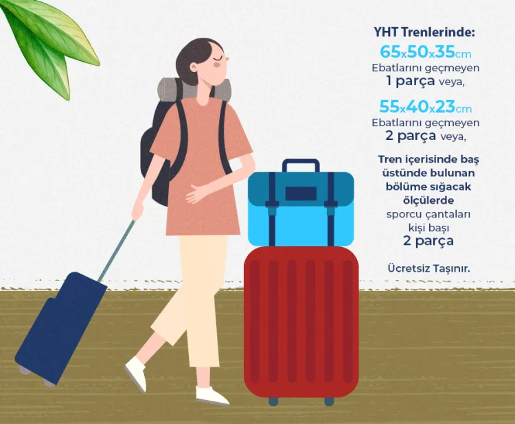 Yüksek Hızlı Trenlerde (YHT) ticari mahiyette olmayan; 65x50x35 cm ölçülerini geçmeyen 1 parça, 55x40x23 cm ölçülerini geçmeyen 2 parça veya baş üstü bagaj bölümüne sığabilecek iki spor çantası ücretsiz taşınabilecek.