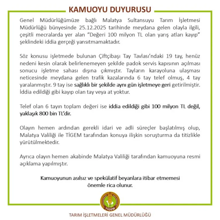MALATYA (İGFA) - Tarım İşletmeleri Genel Müdürlüğü, Malatya Sultansuyu Tarım İşletmesi’nde 25 Aralık 2025’te yaşanan olayla ilgili bazı sosyal medya ve haber sitelerinde yayılan “100 milyon TL değerinde yarış atları kayıp” iddialarını yalanladı.