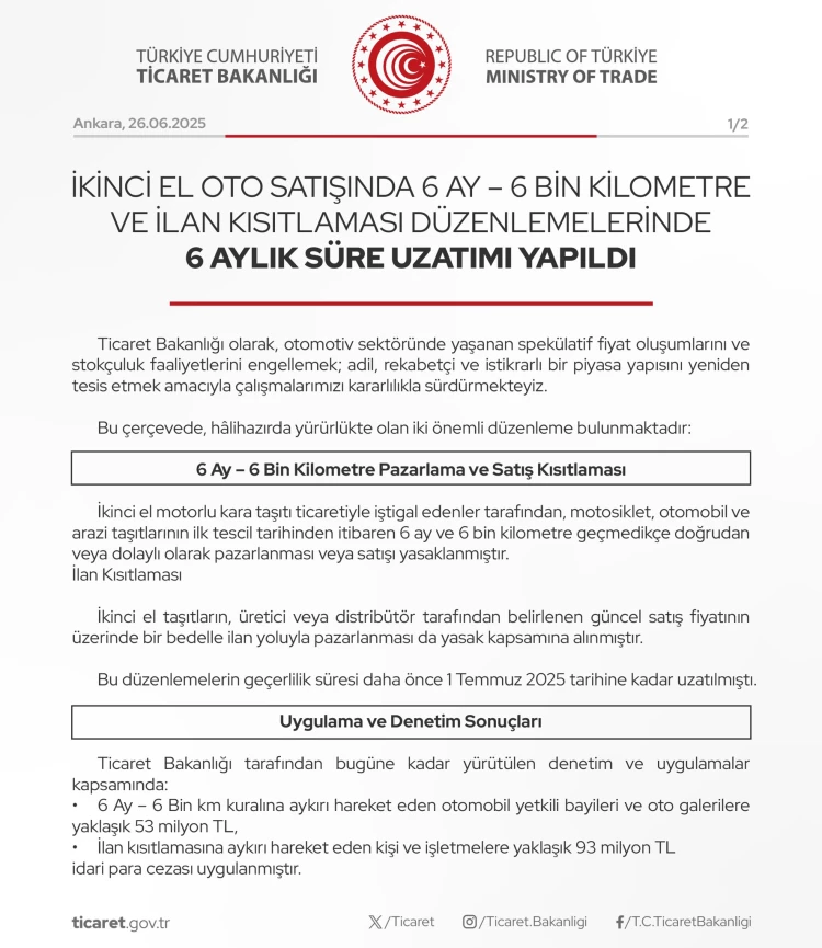 Bakanlık, düzenlemeler kapsamında bugüne kadar 6 ay-6 bin kilometre kuralına uymayan otomobil yetkili bayileri ve oto galerilere yaklaşık 86 milyon TL, ilan kısıtlamasına aykırı davrananlara ise yaklaşık 93 milyon TL idari para cezası uygulanmış olduğunu bildirdi. Bu denetimlerin, sıfır araçların ikinci ele düşürülerek haksız kazanç elde edilmesini engellediği, sıfır araç arzını artırarak gerçek ihtiyaç sahiplerinin araçlara erişimini kolaylaştırdığı ve otomotiv sektöründeki spekülatif fiyat artışlarını önlediği ifade edildi.