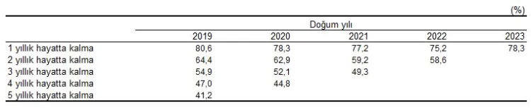 Girişimlerin hayatta kalma oranları da paylaşıldı. 2023 yılında doğan girişimlerin yüzde 78,3’ü, 2022 yılında ise girişimlerin bir yıllık hayatta kalma oranı yüzde 75,2 ve iki yıllık oran yüzde 58,6 olarak kaydedildi.
