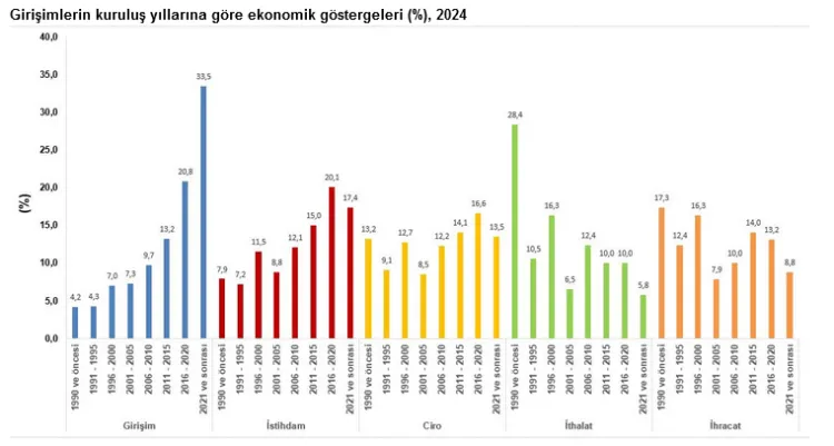 Kuruluş yılına göre değerlendirmelerde ise 2016-2020 yılları arasında kurulan girişimlerin 2024’teki ciro payı yüzde 16,6, istihdam payı yüzde 20,1 oldu. 2021 ve sonrası kurulan girişimler ise yüzde 17,4’lük istihdam payına sahip. Eski girişimlerde ise 1990 ve öncesi kurulan girişimlerin ihracat payı yüzde 17,3, ithalat payı yüzde 28,4 olarak kaydedildi.