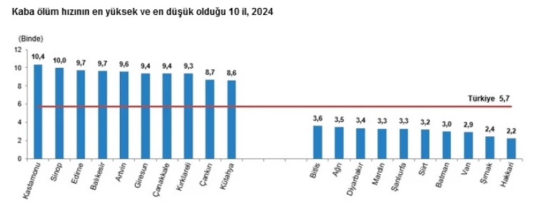 Bin kişi başına düşen ölüm sayısını ifade eden kaba ölüm hızı, 2023’te binde 6,2 iken 2024’te binde 5,7’ye geriledi. Kaba ölüm hızının en yüksek olduğu il binde 10,4 ile Kastamonu olurken, bunu binde 10,0 ile Sinop, binde 9,7 ile Edirne ve Balıkesir, binde 9,6 ile Artvin izledi. En düşük kaba ölüm hızı ise binde 2,2 ile Hakkari’de kaydedildi. Hakkari’yi binde 2,4 ile Şırnak ve binde 2,9 ile Van takip etti.