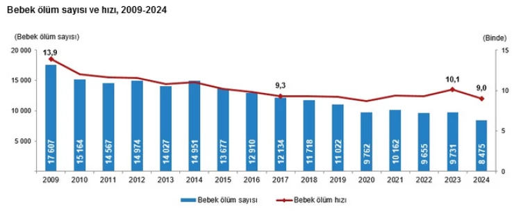 2024’te bebek ölüm sayısı 8 bin 475’e gerileyerek, bebek ölüm hızı binde 9,0’a düştü. 2023’te bu oran binde 10,1’di. Beş yaş altı ölüm hızı da 2023’teki binde 14,7’den 2024’te binde 11,1’e geriledi.