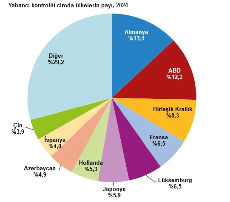 2024 yılında 11 bin 86 yabancı kontrollü girişimden bin 309’u Almanya tarafından kontrol edilirken, bu girişimlerin toplam yabancı kontrollü ciro içindeki payı yüzde 13,1 olarak gerçekleşti.