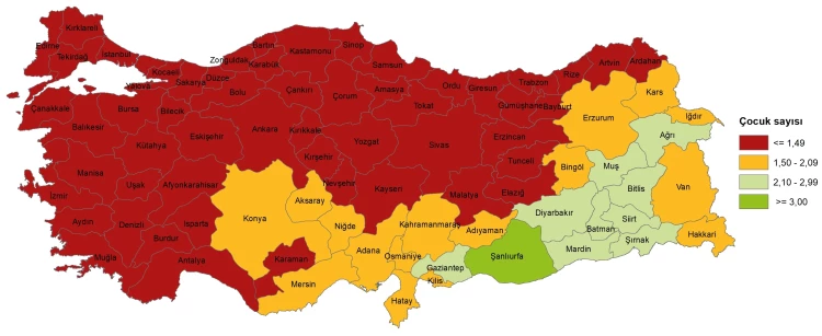 TDF’nin en yüksek olduğu il 3,28 çocukla Şanlıurfa olurken, Şırnak (2,62) ve Mardin (2,32) takip etti. En düşük TDF ise 1,12 ile Bartın ve Eskişehir’de görüldü; Zonguldak ve Ankara (1,15), İzmir (1,17) sıralandı. 2024’te 71 ilde TDF 2,10’un altında kalırken, 55 ilde 1,50’nin altına düştü. Şanlıurfa, TDF’si 3 ve üzerinde olan tek il oldu.