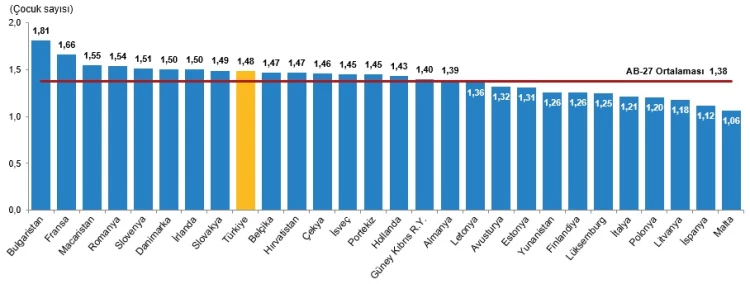 AB ülkelerinde TDF ortalaması 1,38 olurken, Türkiye 1,48 ile 9. sırada yer aldı.