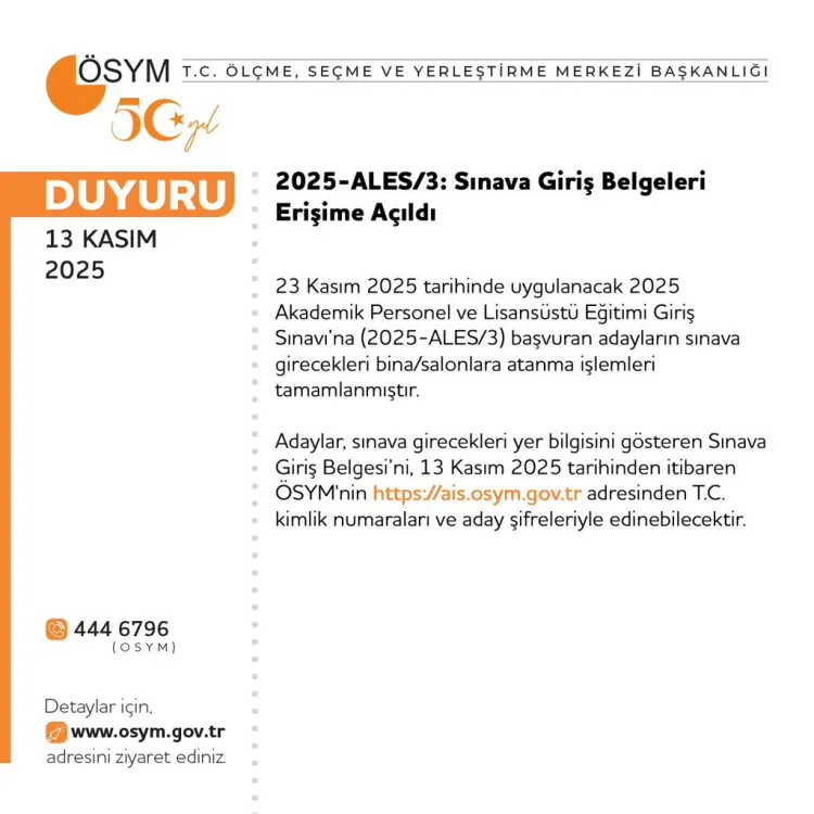 23 Kasım 2025’te yapılacak 2025 Akademik Personel ve Lisansüstü Eğitimi Giriş Sınavı (ALES/3) için adayların sınava giriş belgeleri ÖSYM tarafından erişime açıldı.