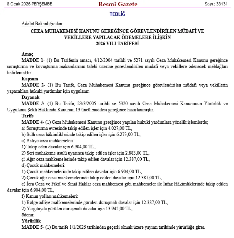 Adalet Bakanlığı, Ceza Muhakemesi Kanunu gereğince görevlendirilen müdafi ve vekillere ödenecek ücretleri Resmi Gazete’de yayımlanan tarife ile açıkladı.