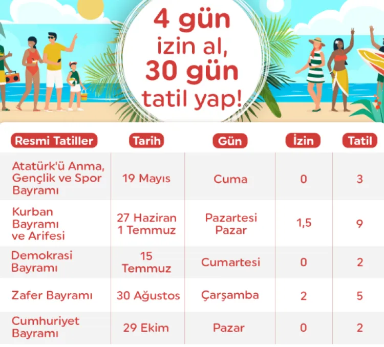 Yıl boyunca farklı dönemlere yayılan tatiller sayesinde dinlenmeye zaman ayırabilir, aile ziyaretleri yapabilir, kısa tatil rotaları oluşturabilir ya da kişisel ilgi alanlarınıza yönelme fırsatı bulabilirsiniz.