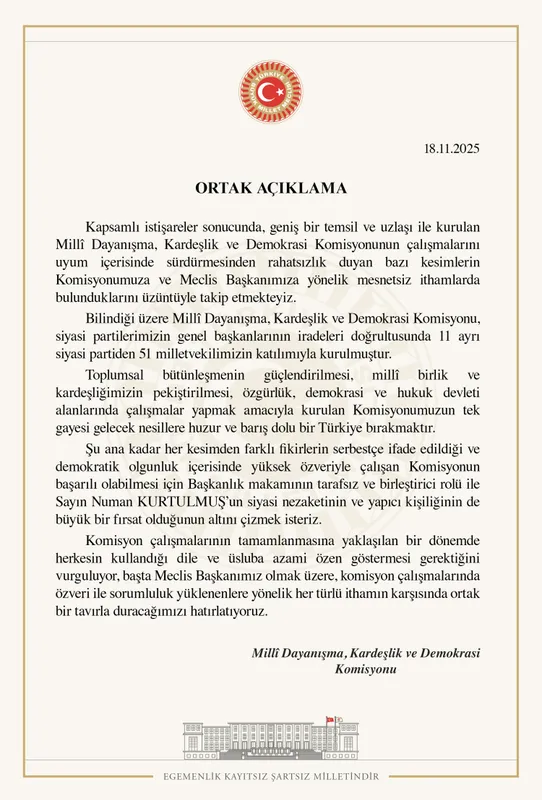 TBMM Başkanlığı, Milli Dayanışma, Kardeşlik ve Demokrasi Komisyonu’nun 17. toplantısına ilişkin detayları paylaşarak komisyonun çalışmalarını hedef alan eleştirilerle ilgili sert bir açıklama yaptı. 21 Kasım'da yeniden toplanacak komisyonun gündeminde İmralı Yüksek Güvenlikli Ceza İnfaz Kurumuna gidilmesi konusu görüşülecek.
