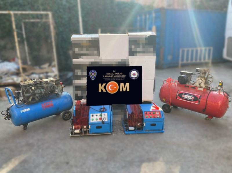 Polis ekipleri tarafında Kocaeli’nin Başiskele ilçesinde bir iş yerinde arama yapıldı. Yapılan aramada 43 bini içi dolu, 175 bin TAPDK bandrolü bulunmayan toplam 218 bin makaron, 55 sökülmüş TAPDK bandrolü, 2 sigara sarma makinası, 2 kompresör, 160 kilogram kıyılmış tütün ele geçirildi. Malzemelere el konulurken olayla ilgili 2 kişi hakkında işlem başlatıldı.
