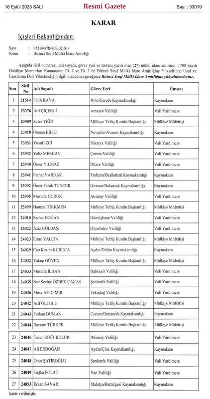 Bugünkü Resmi Gazete'de yayımlanan İçişleri Bakanlığı kararıyla 27 mülki idare amirinin birinci sınıf mülki idare amirliğine yükseltildi.