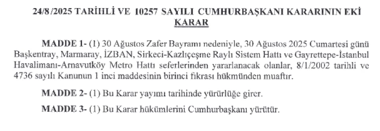 Cumhurbaşkanı Recep Tayyip Erdoğan'ın imzasıyla yayımlanan karara göre, vatandaşlar 30 Ağustos Zafer Bayramı'nda Başkentray, Marmaray, İZBAN, Sirkeci-Kazlıçeşme Raylı Sistem Hattı ve Gayrettepe-İstanbul Havalimanı-Arnavutköy Metro Hattı seferlerinden ücretsiz faydalanabilecek.
