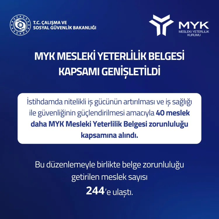 Bakan Prof. Dr. Vedat Işıkhan, iş sağlığı ve güvenliği açısından kritik alanlar ile yeşil ve dijital dönüşüm odaklı mesleklerin Mesleki Yeterlilik Belgesi zorunluluğu kapsamına alındığını açıkladı. Söz konusu düzenlemeyle birlikte 40 yeni meslek daha Mesleki Yeterlilik Belgesi zorunluluğu kapsamına girerken, belge zorunluluğu getirilen meslek sayısı 204’ten 244’e yükseldi.