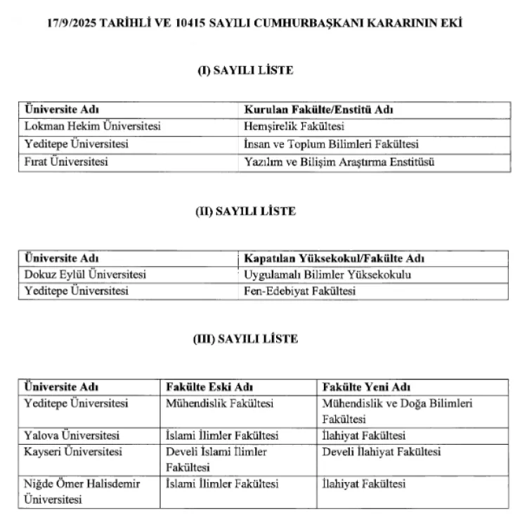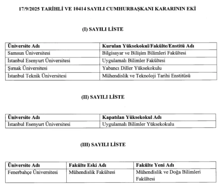 ANKARA (İGFA) - Cumhurbaşkanlığı Kararı ile Türkiye genelinde bazı üniversitelerde yeni fakülte, enstitü ve yüksekokullar kuruldu, bazı birimler kapatıldı, fakülte isimleri değiştirildi. Kararlar, bugünkü Resmi Gazete’de yayımlanarak yürürlüğe girdi.