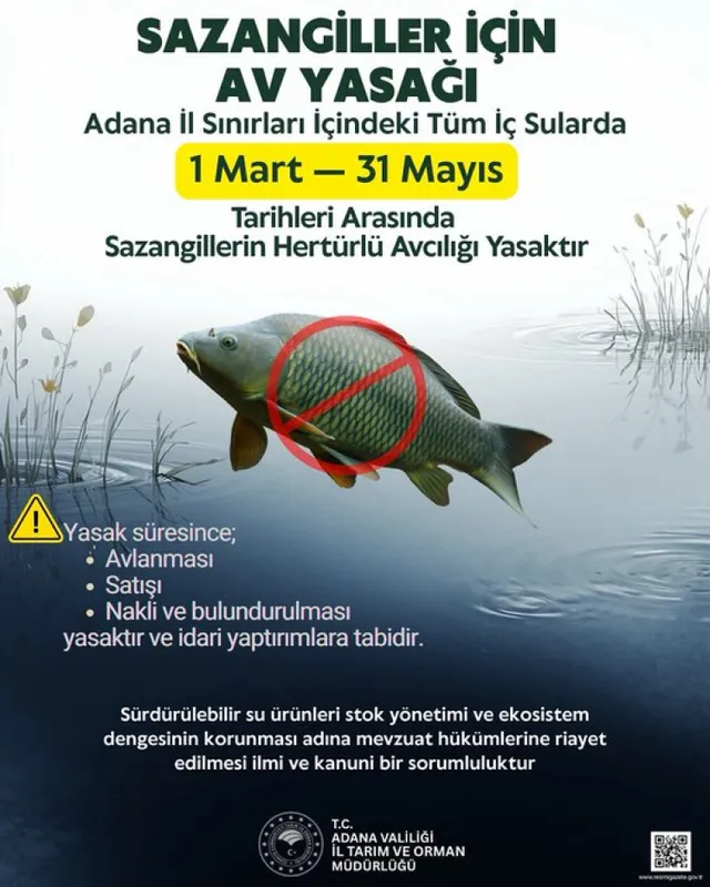 ADANA (İGFA) - Adana İl Tarım ve Orman Müdürlüğü tarafından yapılan duyuruda, Adana il sınırları içerisindeki tüm iç sularda sazangiller için av yasağının 1 Mart itibarıyla başladığı ve 31 Mayıs’a kadar devam edeceği bildirildi.