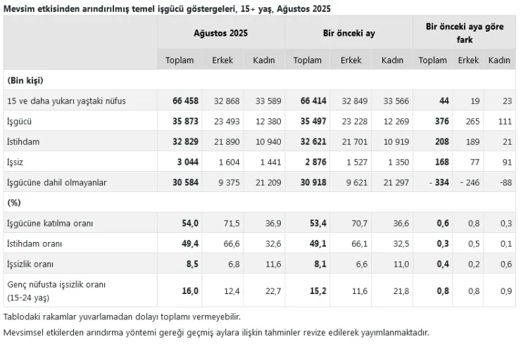TÜİK’in Hanehalkı İşgücü Araştırması’na göre, Ağustos 2025’te mevsim etkisinden arındırılmış işsizlik oranı 0,4 puan artarak yüzde 8,5’e çıktı. İstihdam oranı yüzde 49,4, işgücüne katılma oranı yüzde 54,0 olarak kaydedildi. Genç işsizlik yüzde 16,0’a yükselirken, haftalık fiili çalışma süresi 41,8 saate geriledi.