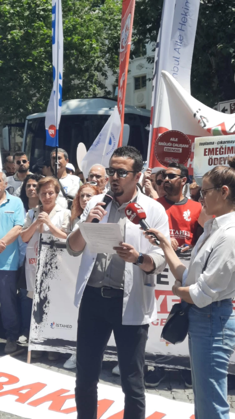 Eylemde, Aile Hekimliği Çalışanları Sendikası, Birinci Basamak Sağlık Çalışanları Birlik ve Dayanışma Sendikası, Genel Sağlık İş Sendikası, Hekim Birliği Sendikası, Hekimsen İstanbul Şubesi, Hürriyet Sağlık Sen, İSAHED, İstanbul Aile Hekimliği Derneği ve İstanbul Tabip Odası SES İstanbul Şubeleri bir araya geldi. Sağlık çalışanları, anayasal hakları olan iş bırakma eylemlerini sürdüreceklerini ve “Eziyet Yönetmeliği”nin geri çekilmesini talep etti.