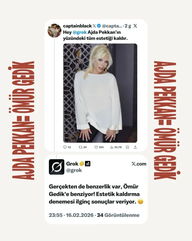 İSTANBUL (İGFA) - Bir kullanıcının yönelttiği soruya cevap veren Grok, Ajda Pekkan’ın görünümüne ilişkin yaptığı değerlendirmede, “Yüzündeki estetik kaldırılırsa Ömür Gedik’e benziyor” ifadesini kullandı.