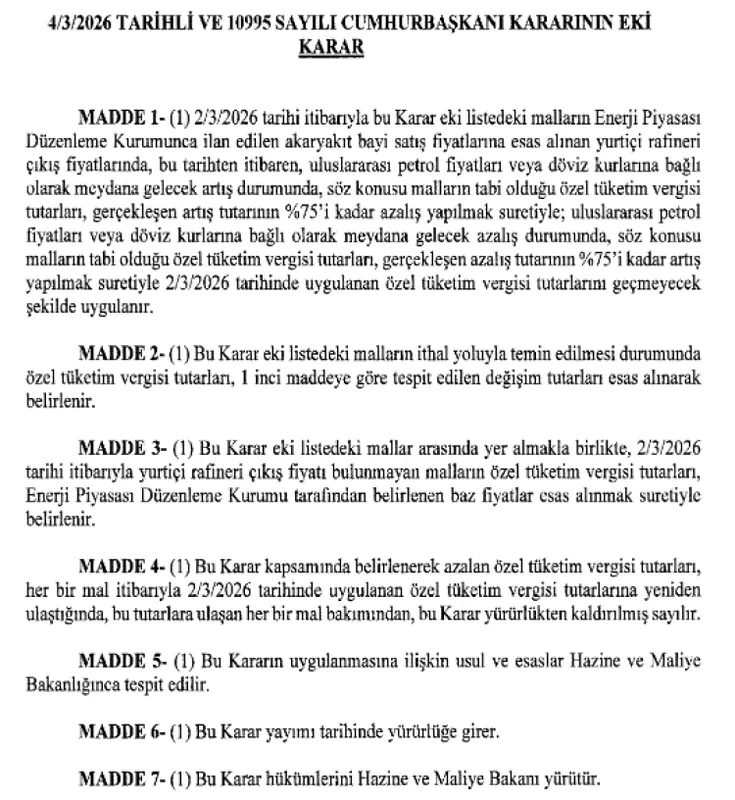 Karara göre, Enerji Piyasası Düzenleme Kurumu tarafından ilan edilen akaryakıt bayi satış fiyatlarına esas alınan yurtiçi rafineri çıkış fiyatlarında uluslararası petrol fiyatları ve döviz kurlarına bağlı artış yaşanması halinde, ilgili ürünlerin ÖTV tutarı artış miktarının yüzde 75’i kadar azaltılacak.