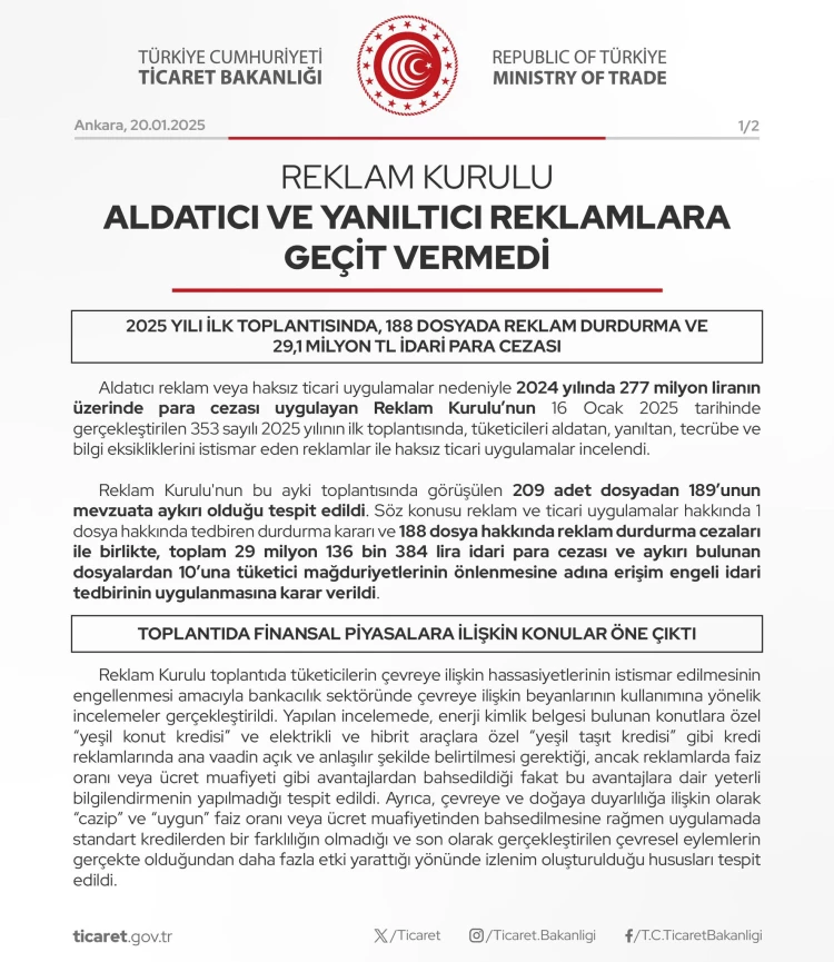 Ticaret Bakanlığı bünyesindeki Reklam Kurulu, aldatıcı ve yanıltıcı reklamlar geçit vermedi. Yeni yılın ilk toplantısında 188 dosyada reklam durdurma ve 29,1 milyon TL'lik idari para cezası kararı alındı.