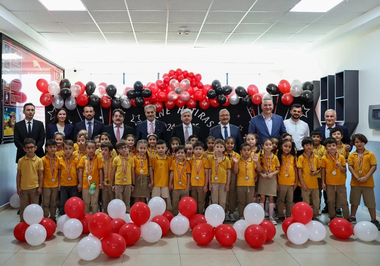 Minik öğrencilerin hazırladığı yöresel halk oyunu gösterisi ile başlayan karne töreninde Başkan Alemdar, okulda çocuklar tarafından çizilen resimler, geri dönüşüm malzemelerinden üretilmiş el emeği maketleri inceledi.