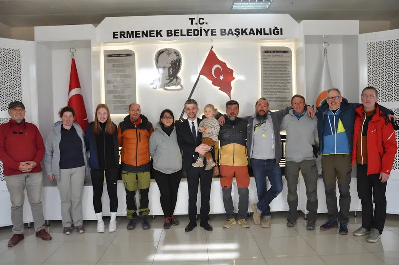 Alman Yamaç Paraşütü Okulu Sky-Team Gleitschirmschule'nin eğitmen ve sporcuları, Hulusi Oran ile birlikte Ermenek Belediye Başkanı Mustafa Bozcu'yu makamında ziyaret etti.