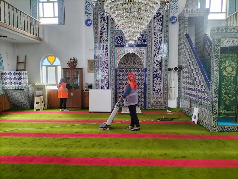 Ayrıca camiler de dip bucak temizliyor. Camilerin camlarından, ayakkabılığa, mihrap ve kürsüden avizelere kadar her yeri titizlikte temizleyen ekipler aynı zamanda cami zemininde bulunan halıları da süpürüyor. Cami avluları da yıkanarak, ibadethanelerin hijyen koşulları arttırılıyor.