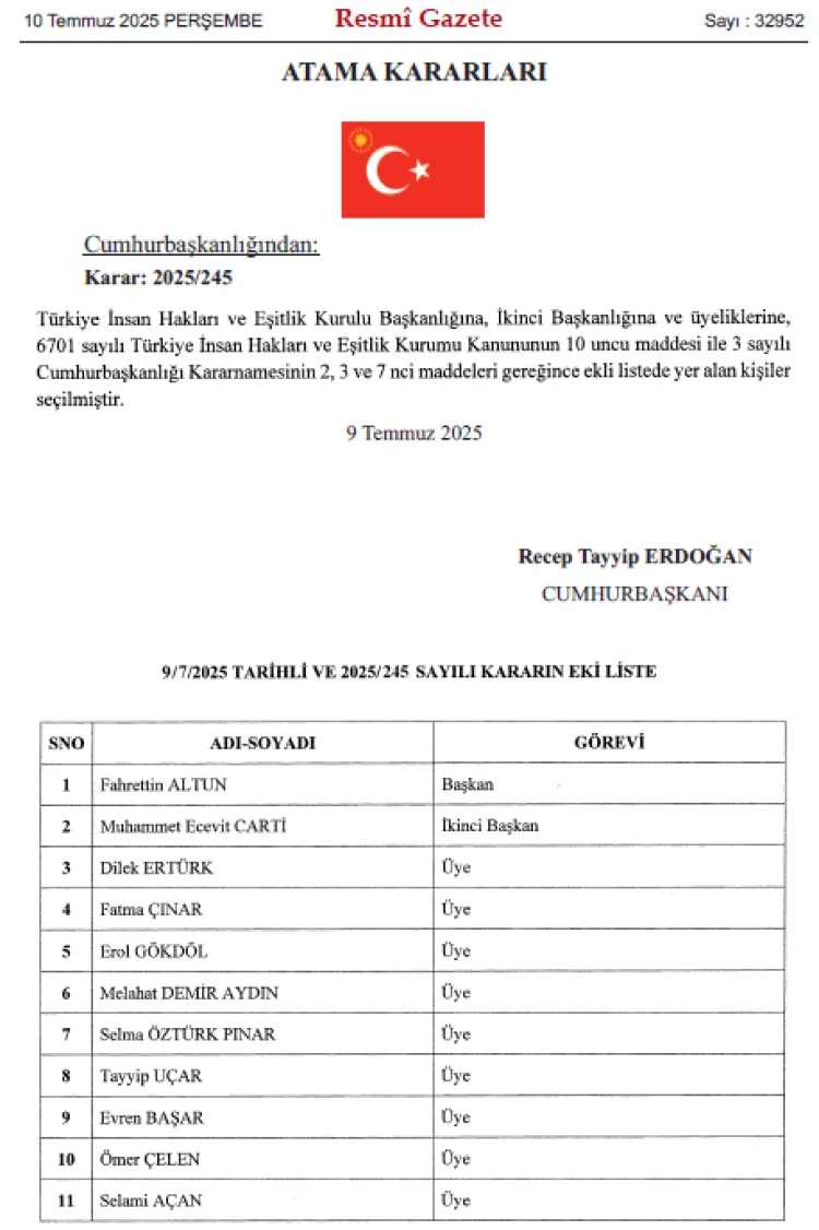 Ayrıca Resmi Gazete’de yayımlanan kararlara göre Prof. Dr. Fahrettin Altun başkanlığındaki TİHEK'in kurulunun teşkilatlanması şöyle oluştu. Muhammet Ecevit Carti TİHEK'in ikinci başkanı olurken; Dilek Ertürk, Fatma Çınar, Erol Gökdöl, Melahat Demir Aydın, Selma Öztürk Pınar, Tayyip Uçar, Evren Başar, Ömer Çelen ve Selami Açan üye oldu.