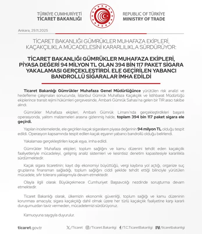 Ticaret Bakanlığı, operasyonun ardından yaptığı açıklamada, Gümrükler Muhafaza ekiplerinin gelişmiş analiz sistemleri ve kesintisiz denetim kapasitesiyle kaçakçılık faaliyetlerine karşı mücadelesini kararlılıkla sürdürdüğünü vurguladı. Açıklamada, kaçak sigara ticaretinin yalnızca vergi kaybına yol açmadığı; aynı zamanda kayıt dışı ekonomiyi büyüttüğü, organize suç gruplarına finansman sağladığı ve toplum sağlığını ciddi biçimde tehdit ettiği ifade edildi.