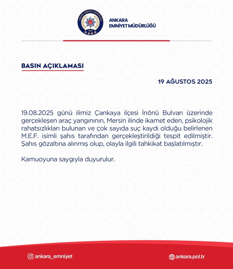ANKARA (İGFA) - Ankara Emniyet Müdürlüğü, Çankaya'daki araç yangınının Mersin’de ikamet eden, psikolojik rahatsızlıkları bulunduğu ve çok sayıda suç kaydı tespit edilen M.E.F. isimli şahıs tarafından gerçekleştirildiği belirtildi.