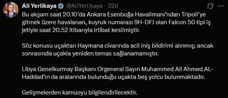 Bakana Yerlikaya, uçaktan Haymana civarında acil iniş bildirimi alındığını, ancak sonrasında uçakla yeniden temas kurulamadığını açıkladı. Uçakta, Libya Genelkurmay Başkanı Orgeneral Muhammed Ali Ahmed Al-Haddad’ın da aralarında bulunduğu 5 yolcunun bulunduğu bildirildi.