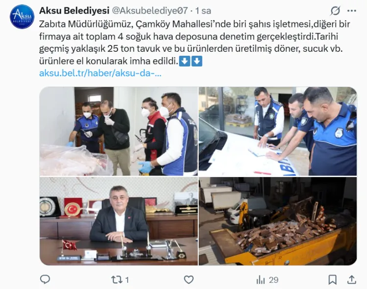 Sürekli kapalı tutulan ve kötü kokular gelen bir şahıs işletmesinde yapılan denetimde yaklaşık 800 kilo tarihi geçmiş tavuk, but, taşlık ve çeşitli tavuk ürünleri tespit edildi. Ürünler imha edilmek üzere Aksu Tarım ve Orman İlçe Müdürlüğü ile polis ekiplerine bildirildi.
