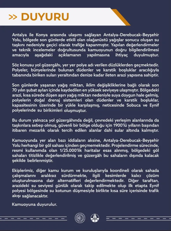 ANKARA (İGFA) - Karayolları Genel Müdürlüğü, Antalya ile Konya arasında ulaşımı sağlayan Antalya-Derebucak-Beyşehir Yolu’nda son günlerde etkili olan aşırı yağışlar nedeniyle taşkın meydana geldiğini ve güzergâhın geçici olarak trafiğe kapatıldığını duyurdu.