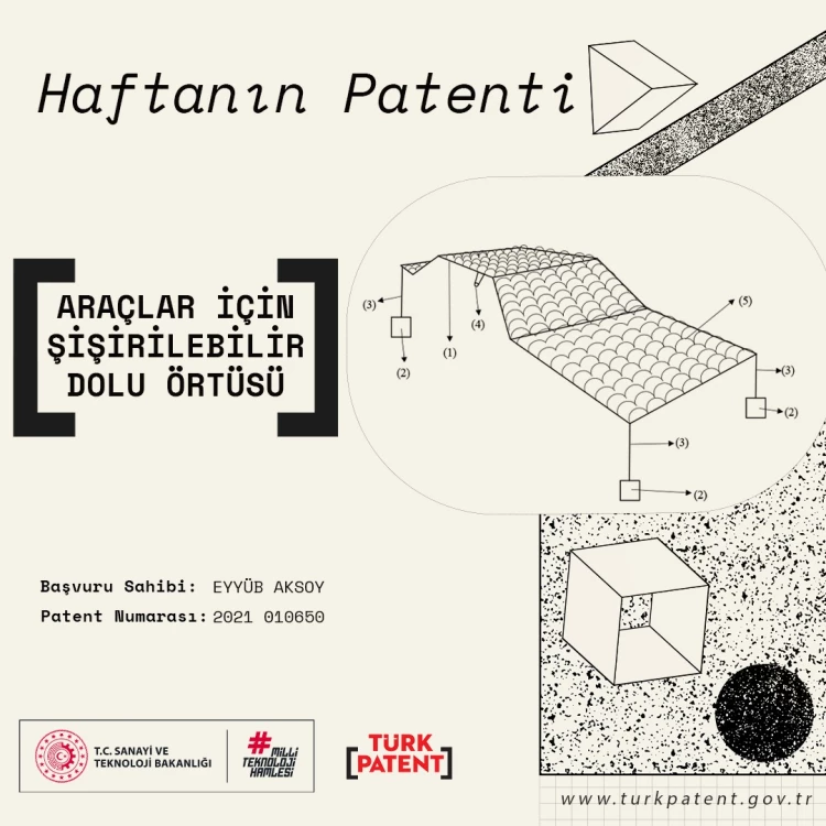 İklim değişikliğiyle artan ani dolu yağışlarının araçlarda yol açtığı hasarları önlemeyi amaçlayan 2021-010650 patent nolu buluşun, araç üzerine serilerek mıknatıslarla sabitlenen ve araç çakmak girişinden enerji alan hava motoruyla şişirilen bir örtü olduğu belirtilirken, dolu taneleriyle araç arasında hava katmanı oluşturarak hasarı engellediği belirtildi.