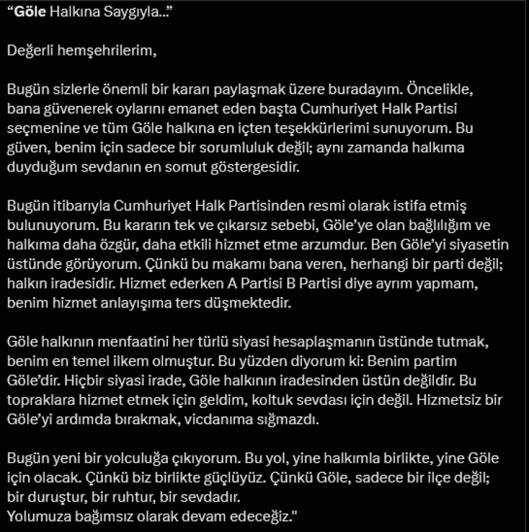 “Bana güvenerek oylarını emanet eden başta CHP seçmenine ve tüm Göle halkına teşekkürlerimi sunuyorum" diyen Başkan Budak, açıklamasında, "Bu güven, benim için sadece bir sorumluluk değil, halkıma duyduğum sevdanın en somut göstergesidir. Bugün itibarıyla CHP’den resmi olarak istifa etmiş bulunuyorum. Bu kararın tek sebebi, Göle’ye olan bağlılığım ve halkıma daha özgür, daha etkili hizmet etme arzumdur. Göle’yi siyasetin üstünde görüyorum. Çünkü bu makamı bana veren bir parti değil, halkın iradesidir.” ifadelerine yer verdi.