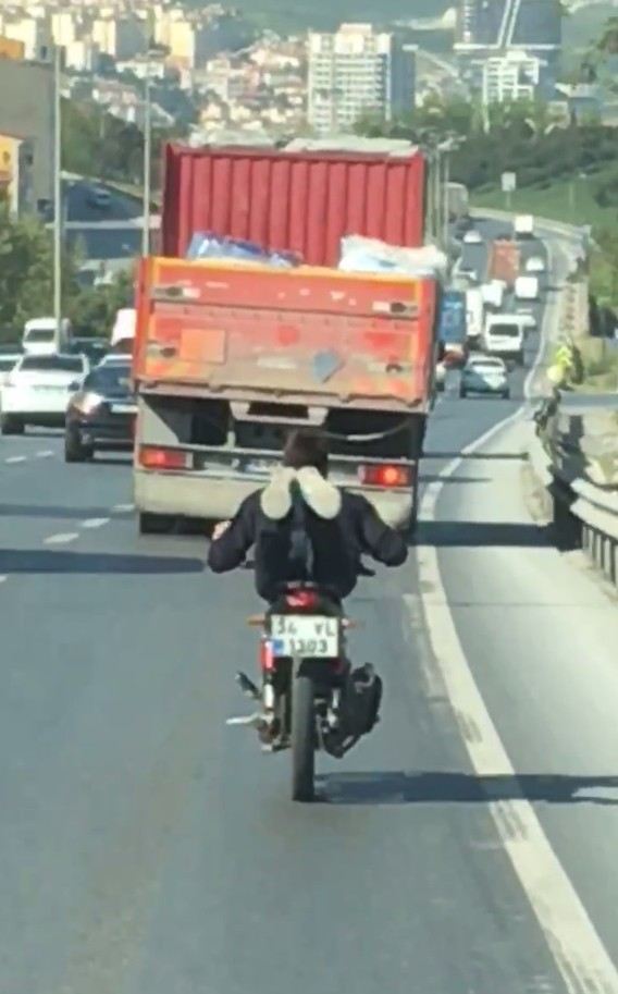 İstanbul?da motosikletinin üzerine yatarak yolculuk yapan ve adeta ölüme meydan okuyan sürücü, görenleri hayrete düşürdü. Kimliği öğrenilemeyen 34 VL 1303 plakalı motosiklet sürücüsünün yaptığı tehlikeli hareketler trafikte korku dolu anların yaşanmasına neden oldu. Ayaklarını da havaya kaldıran sürücü, kendi canını hiçe saydığı gibi trafikteki diğer sürücüleri de tehlikeye attı. Kasksız motosikletlinin tehlikeli şovu ise diğer sürücüler tarafından saniye saniye görüntülendi.