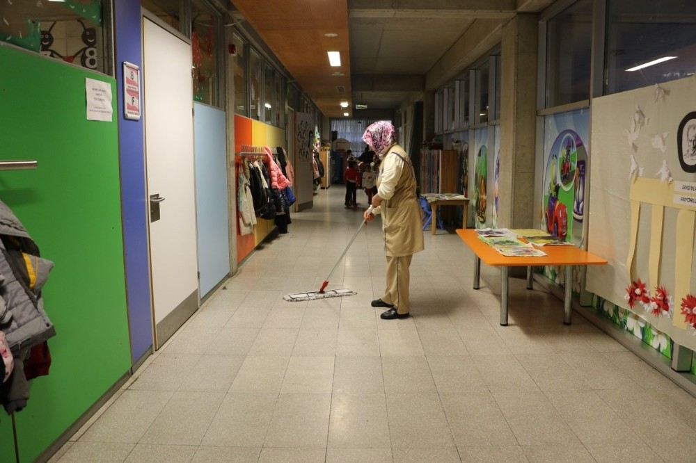 Her okul için ayrı ayrı görevlendirilen sabit temizlik personelleri ise yıl boyunca okullarda hizmet veriyor.