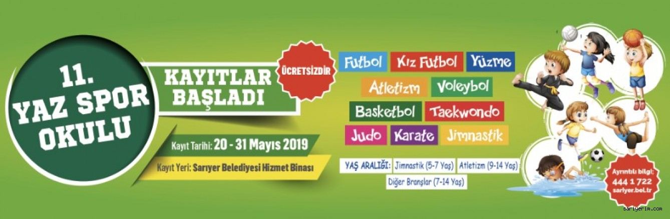 Sarıyer?de bu yıl 11?incisi düzenlenecek olan ve çocuklara sporu sevdiren Yaz Spor Okulları kayıtları başladı. 7 ile 14 yaş arasındaki çocukların başvurabileceği okulda jimnastik derslerinin yaş sınırı 5-7, atletizm derslerinin yaş sınırı ise 9? 14 olarak belirlendi. Kayıtlar 31 Mayıs?a kadar Sarıyer Belediyesi Hizmet Binası`nda devam edecek. Sarıyer Belediyesi Spor İşleri Müdürlüğü tarafından düzenlenen okullarda toplamda 10 branşta eğitim verilecek. Çocukların yeteneklerini keşfetme imkânı bulacağı Yaz Spor Okulları?nda; yüzme, jimnastik, atletizm, futbol, kız futbol, voleybol, basketbol, taekwondo, judo, karate dersleri verilecek. Ücretsiz kıyafet ve servis imkanın da sağlandığı okullara her sene olduğu gibi bu sene de yoğun katılım bekleniyor.