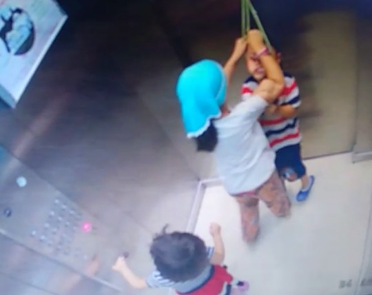 Asansör kapısının arasında sıkışan ipin asansörle birlikte yukarı doğru ilerlemesi saniye saniye asansörün kamerasına yansıdı. Görüntüde, çocuğun da iple birlikte boynundan yukarı doğru kalması görülüyor. O anlarda ise başka bir çocuk hemen olaya müdahale ederek çocuğun boynundan ipi çıkarttı.