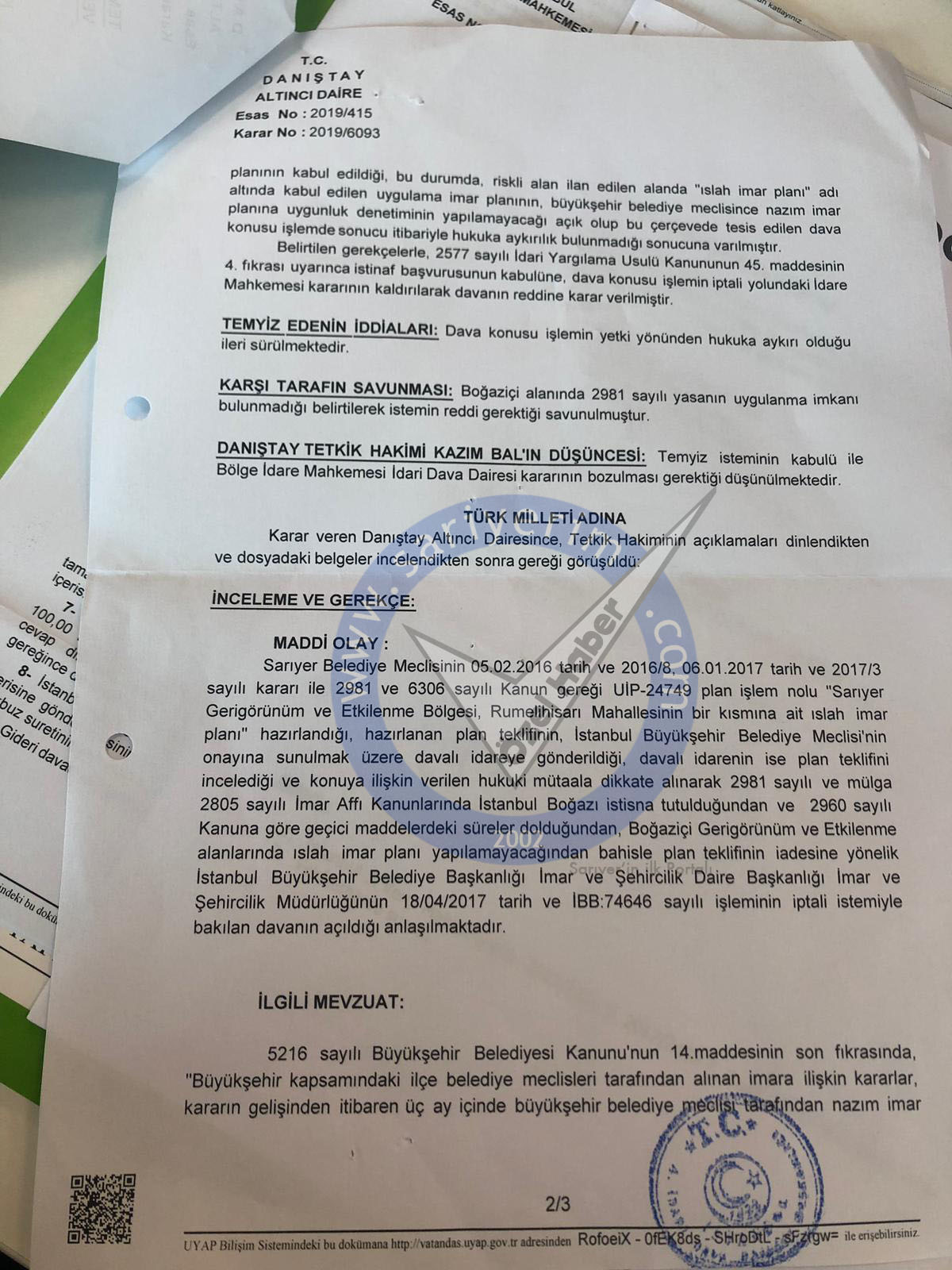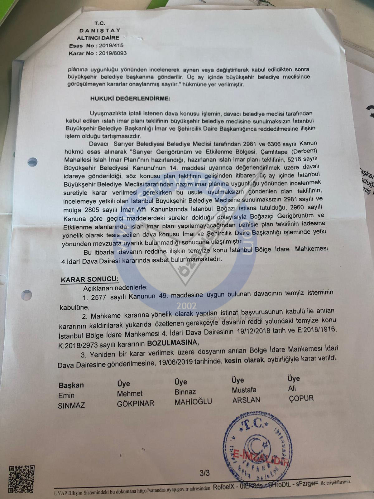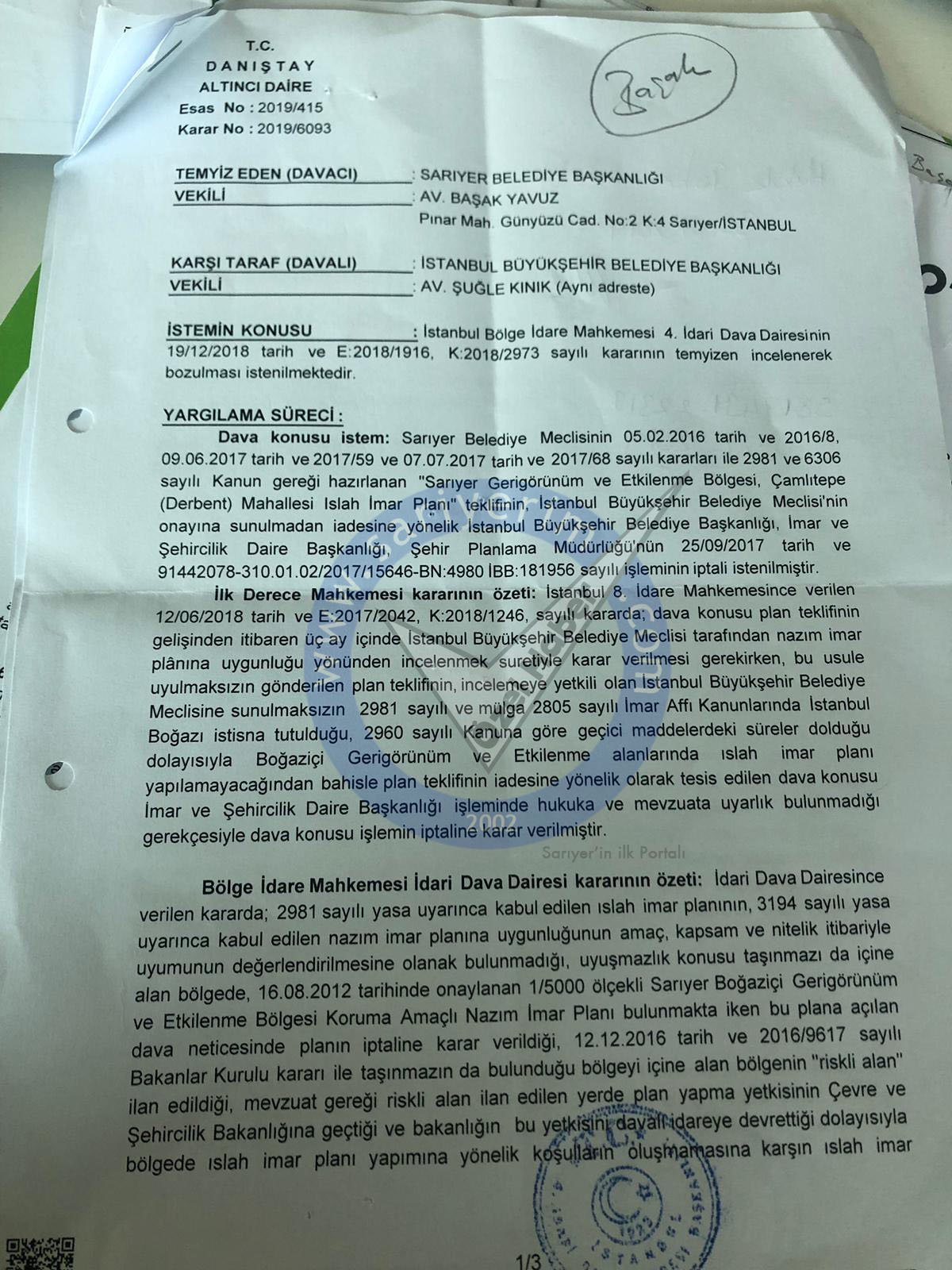 Derbent halkının ve Sarıyer Belediyesinin Danıştaya yaptığı itiraz Altıncı Dairede 2019/415-2019/6093 karar numarasıyla görüşülerek karara bağlandı ve karar neticesinde Sarıyer Belediyesi, Belediye Meclisi tarafından 2981 ve 6036 sayılı Kanun hükmü esas alınarak ?Sarıyer Gerigörünüm ve Etkilenme Bölgesi, Çamlıtepe (Derbent) Mahallesi İslah İmar Plan?ının hazırlandığı, hazırlanan ıslah imar planı teklifinin 5216 sayılı Büyükşehir Belediyesi Kanunu?nun 14. Maddesi uyarınca değerlendirmek üzere İBB?ye gönderildiği plan teklifinin gelişinden itibaren üç ay içinde İBB Meclisi tarafından nazım imar planına uygunluğu yönünden incelenmek suretiyle karar verilmesi gerekirken bu usule uyulmaksızın gönderilen plan teklifinin incelemeye yetkili olan İBB Meclisine sunulmaksızın 2981 sayılı ve mülga 2805 sayılı İmar Affı kanunlarında İstanbul Boğazı İstisna tutulduğu 2960 sayılı kanuna göre geçici maddelerdeki süreler dolduğu dolayısıyla Boğaziçi Gerigörünüm ve Etkilenme alanlarında ıslah imar planı yapılamayacağından bahisle teklifin iadesine yönelik olarak tesis edilen dava konusu İmar ve Şehircilik daire Başkanlığı işleminde yetki yönünden mevzuata uyarlılık bulunmadığı sonuca ulaşıldığı belirtilen kararda, davanın reddine ilişkin temyize konu İstanbul Bölge İdare Mahkemesi 4. İdari dava Dairesi kararında isabet bulunmadığı belirtildi.