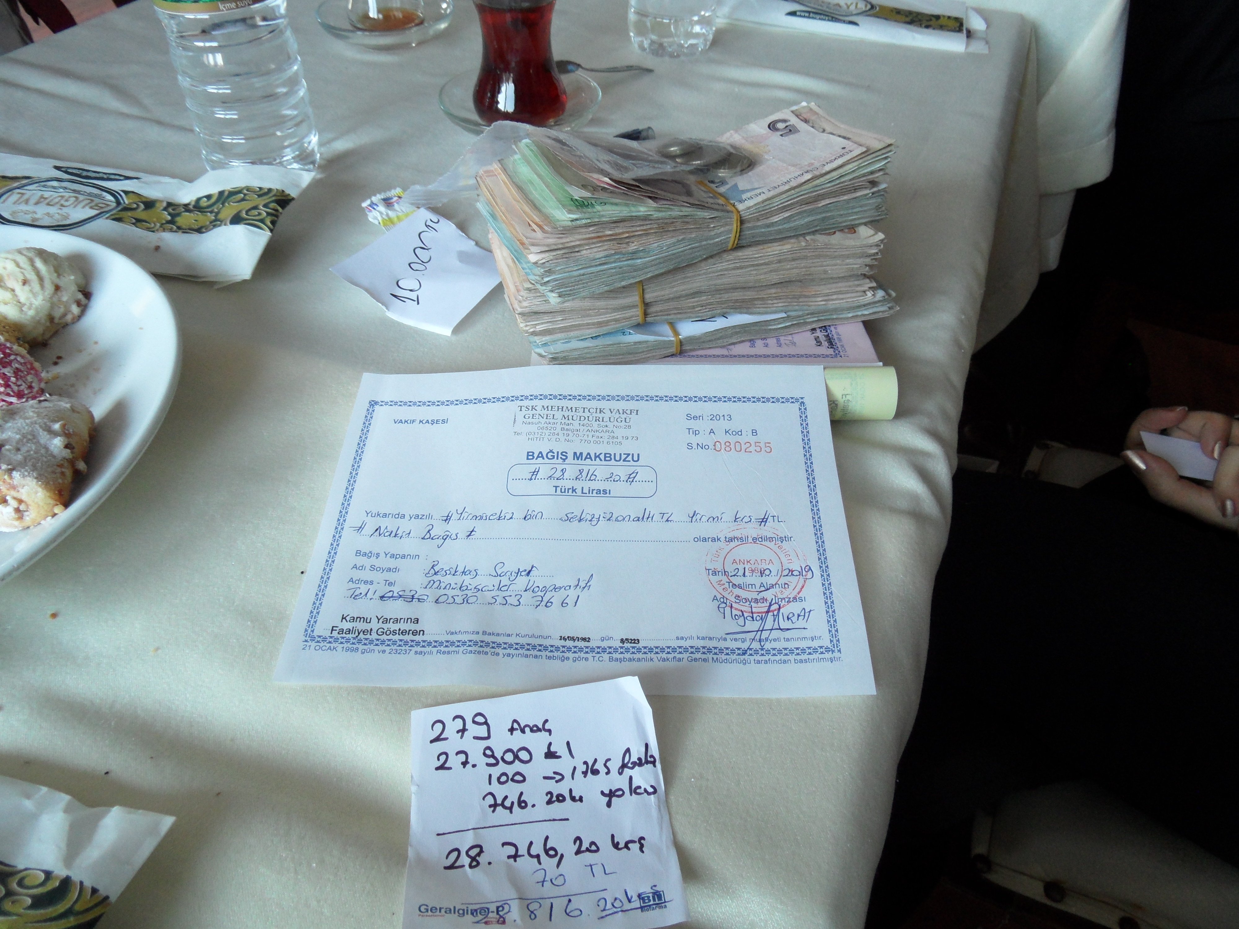 Sarıyer Minibüsçüler Kooperatif Başkanı Hakan Akkaya, Başkan Yardımcısı Faruk Gülsoy, Yönetim Kurulu üyesi Mehmet Ali Kaymak ve Minibüs Esnaflarından Halil Gülsoy tarafından kampanya günü çalışan 279 araç ile akşama kadar 28.000 lira yolculardan gelen tarife üstü acretler 746,20 lira ve son anda bir vatandaşın ısrarla kampanyaya katkıda bulunmak istemesi nedeniyle vermiş olduğu 70 lirayla birlikte toplam 28.816 lira 20 kuruş Mehmetçik Vakfı Avrupa Bölgesi Temsilcisi Em. Albay Gürkan Gülçin ve Bağış İşlemleri Uzmanı İlayda Fırat`a teslim edildi.