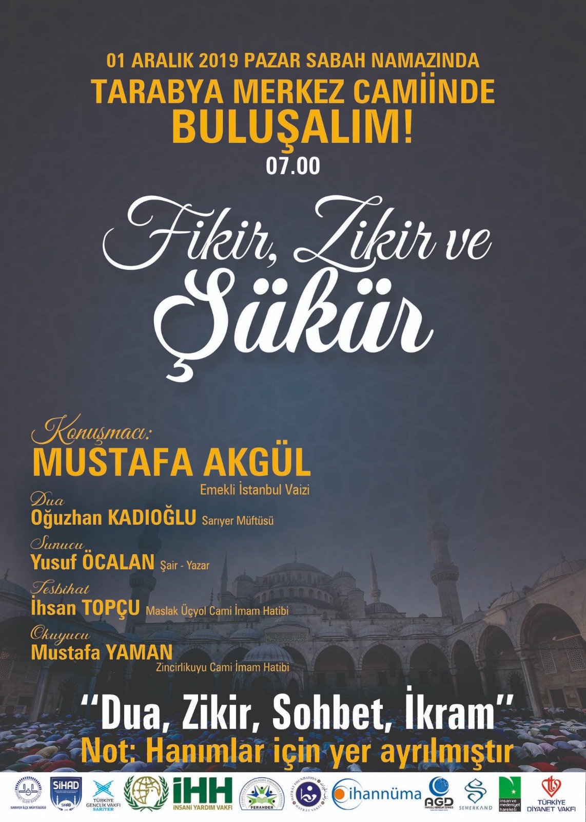 Tarabya Merkez Camiinde Hafızlar, Kazım Karagöz ve Sadık Güder`in okuduğu Yasin-i Şerifin ardından Cami İmam Hatibi Hafız Murat Ergin tarafından kıldırılan sabah namazını müteakiben başlayan proğramda İstanbul Müftülüğü Emekli Başvaizlerinden Mustafa Akgül hocanın yaptığı Zikir, Fikir ve Şükür başlıklı sohbetini Cami cemaati büyük bir ilgiyle dinledi. Sunumu çeşitli Ayetler ve Hadislerle bezeyen ve gündelik yaşamdan örnekler veren Akgül hocanın sohbeti katılımcılara keyifli anlar yaşattı.