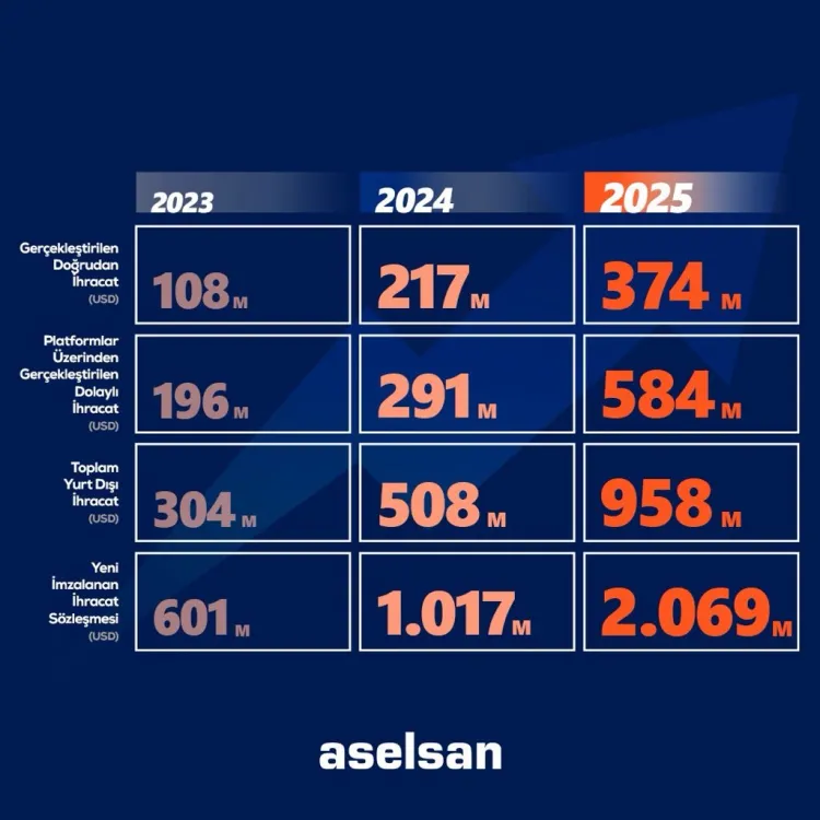 Akyol’un paylaştığı verilere göre ASELSAN, 58 ülke ile 2 milyar doların üzerinde yeni ihracat sözleşmesi imzaladı. Bu süreçte 16 farklı ürün için ilk kez ihracat sözleşmesi yapılırken, 3 yeni ülke ile de ilk defa ihracat anlaşmasına imza atıldı. Böylece ASELSAN’ın ihracat yaptığı ülke sayısı 95’e yükseldi.