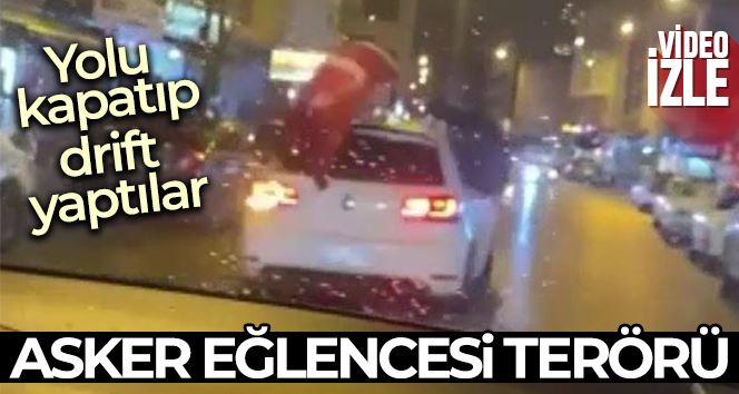 Esenyurt’ta bir grup, asker konvoyu yaparak alt geçidi trafiğe kapattı. Konvoyda bir kişi aracıyla drift yaparak yürekleri ağza getirdi. Meşalelerin yakıldığı konvoyda asker adayı da havaya atıldı. Trafikteki sürücülerin tepki gösterdiği olay cep telefonu kameralarına yansıdı.