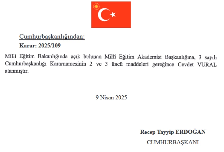 Öte yandan, aynı kararnamede Yükseköğretim Kurulu (YÖK) Üyeliğine İbrahim Şenel’in atandığı duyurulurken, kısa bir süre önce kuruluşu gerçekleşen Milli Eğitim Bakanlığı bünyesinde açık bulunan Milli Eğitim Akademisi Başkanlığı'na Cevdet Vural’ın getirildiği kaydedildi.