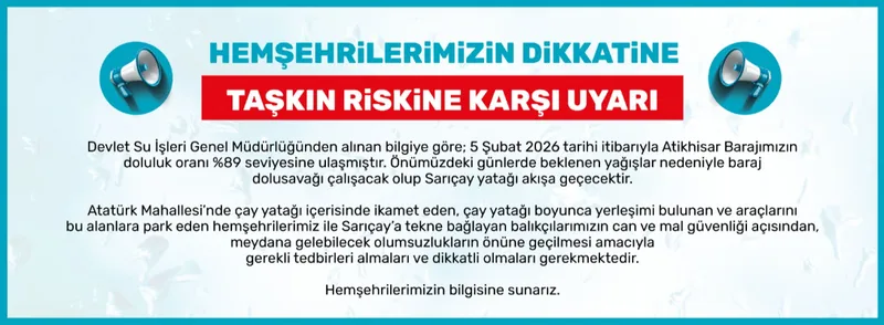 Atatürk Mahallesi'nde çay yatağı içinde ikamet eden, bu alanlarda yerleşimi bulunan veya araçlarını park eden vatandaşlar ile Sarıçay'a tekne bağlayan balıkçılar, can ve mal güvenlikleri açısından gerekli tedbirleri almak ve dikkatli olmak konusunda uyarıldı. Meydana gelebilecek olumsuzlukların önüne geçilmesi amaçlanıyor.