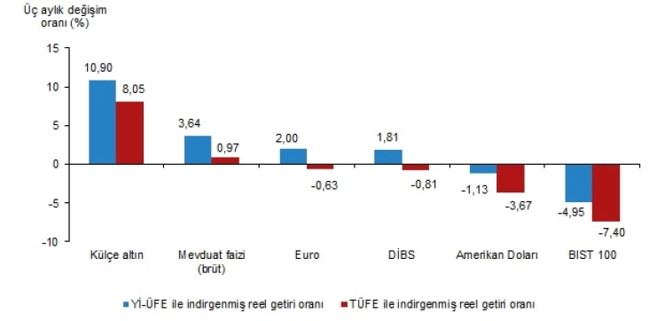 Külçe altın, üç aylık değerlendirmede; Yİ-ÜFE ile indirgendiğinde yüzde 10,90, TÜFE ile indirgendiğinde ise yüzde 8,05 oranlarında yatırımcısına en yüksek reel getiri sağlayan yatırım aracı oldu. Aynı dönemde BIST 100 endeksi, Yİ-ÜFE ile indirgendiğinde yüzde 4,95, TÜFE ile indirgendiğinde ise yüzde 7,40 oranlarında yatırımcısına en çok kaybettiren yatırım aracı oldu.