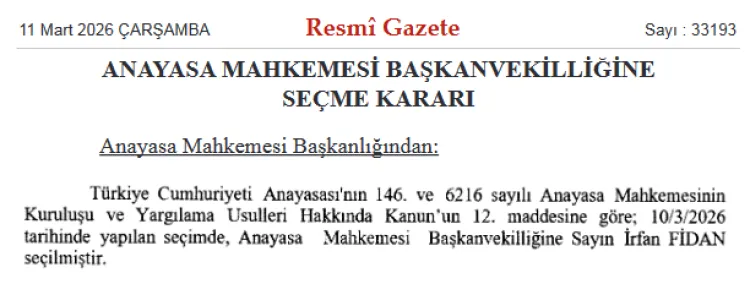 ANKARA (İGFA) - Anayasa Mahkemesi Başkanvekilliği’ne İrfan Fidan’ın seçilmesine ilişkin karar, bugünkü Resmi Gazete’de yayımlandı.